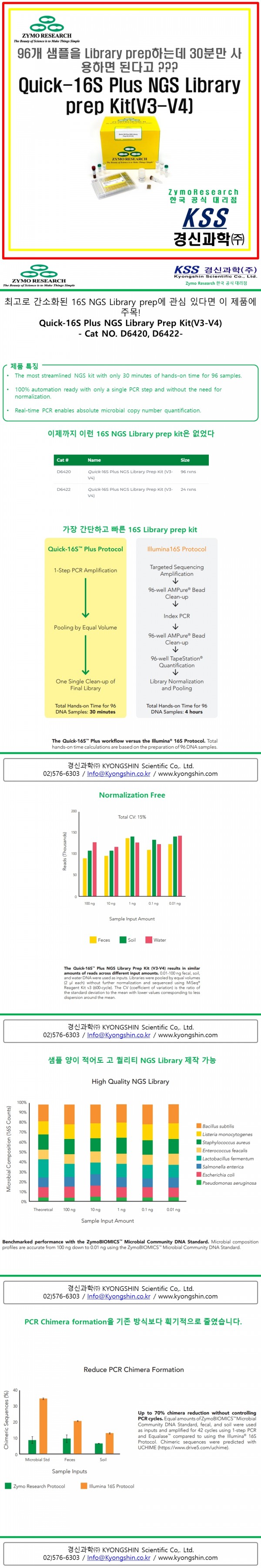이 제품은 가장 간소화된 NGS 키트입니다. 사람 손을 거치는 과정이 단 30분 밖에 걸리지 않습니다(96개 샘플 기준). Automation장비에 완벽히 적합하며 오직 한번의 PCR 과정밖에 없고, Nomalization이 필요하지 않습니다. 또한 Real-Time PCR로 미생물을 정량할 수 있습니다. #KSS #경신과학 #ZymoResearch #NGS #Microbiomics #ZymoBIOMICS #16S #Sequencing #Libraryprep #V3V4