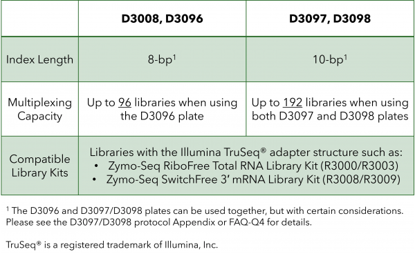 Indexed libraries are compatible with any Illumina® sequencer. These indexes are compatible with the Zymo-Seq RiboFree Total RNA Library Kit and Zymo-Seq SwitchFree 3′ mRNA Library Kit. For greater multiplexing capability, consider the Zymo-Seq UDI Primer Plate (Indexes 1-96, 10-bp) and the Zymo-Seq UDI Primer Plate (Indexes 97-192, 10-bp) (Cat. No. D3097 and D3098 respectively). These plates can be used together to multiplex up to 192 libraries.