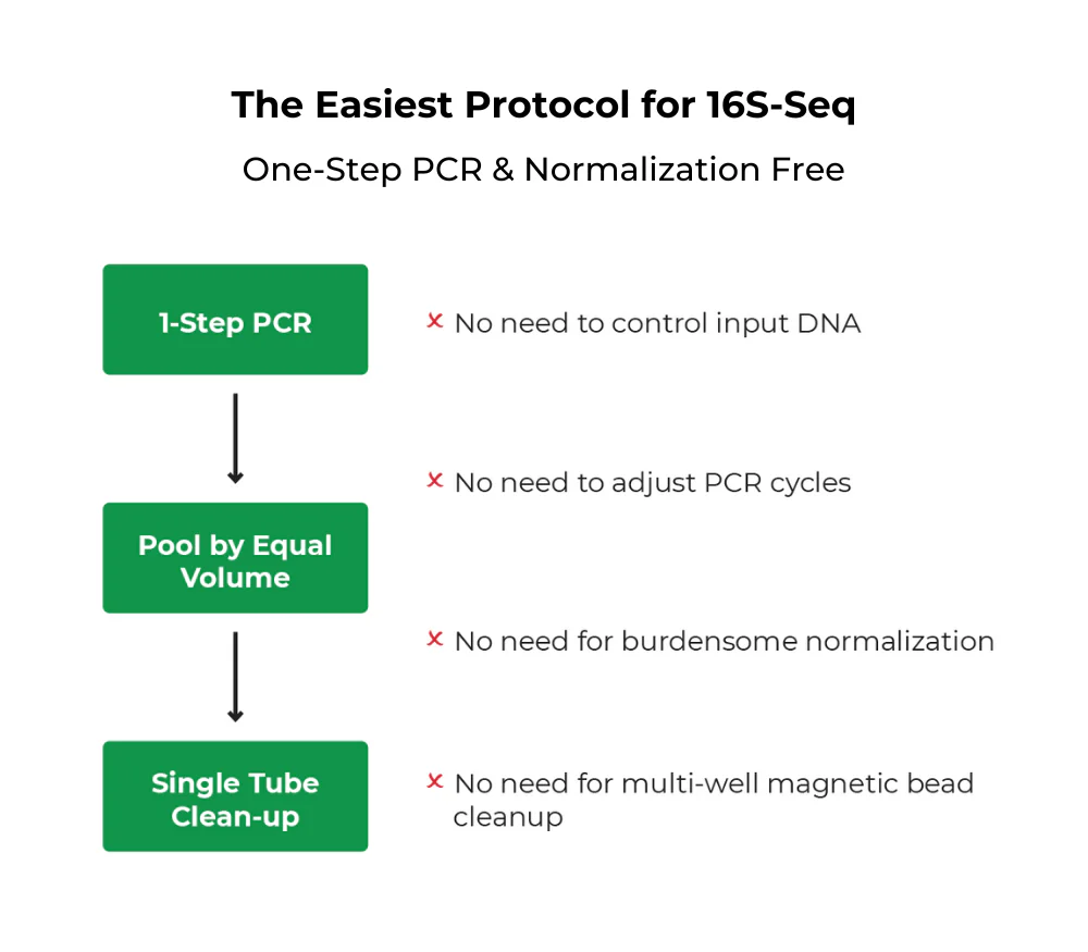 The Quick-16S Plus NGS Library Prep Kit (V3-V4, UDI) is the fastest and simplest NGS library prep targeting the V3-V4 region of the 16S rRNA gene for high-throughput sequencing. The automation-friendly protocol utilizes a single qPCR/PCR for combined targeted amplification and barcode addition using specially designed primers. After pooling by equal volume, a single clean-up of the final library is performed, rather than massive AMPure® bead-based clean-ups. Additional library quantification analysis such as TapeStation® analysis or gel electrophoresis are not necessary. With these features, the workflow dramatically reduces the hands-on time of library preparation to only 30 minutes.
