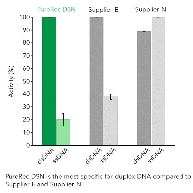 PureRec Duplex-Specific Nuclease (DSN) is an endonuclease that selectively digests double-stranded DNA (dsDNA) and DNA in DNA-RNA hybrids, exhibiting virtually no activity towards single-stranded DNA (ssDNA) or RNA.