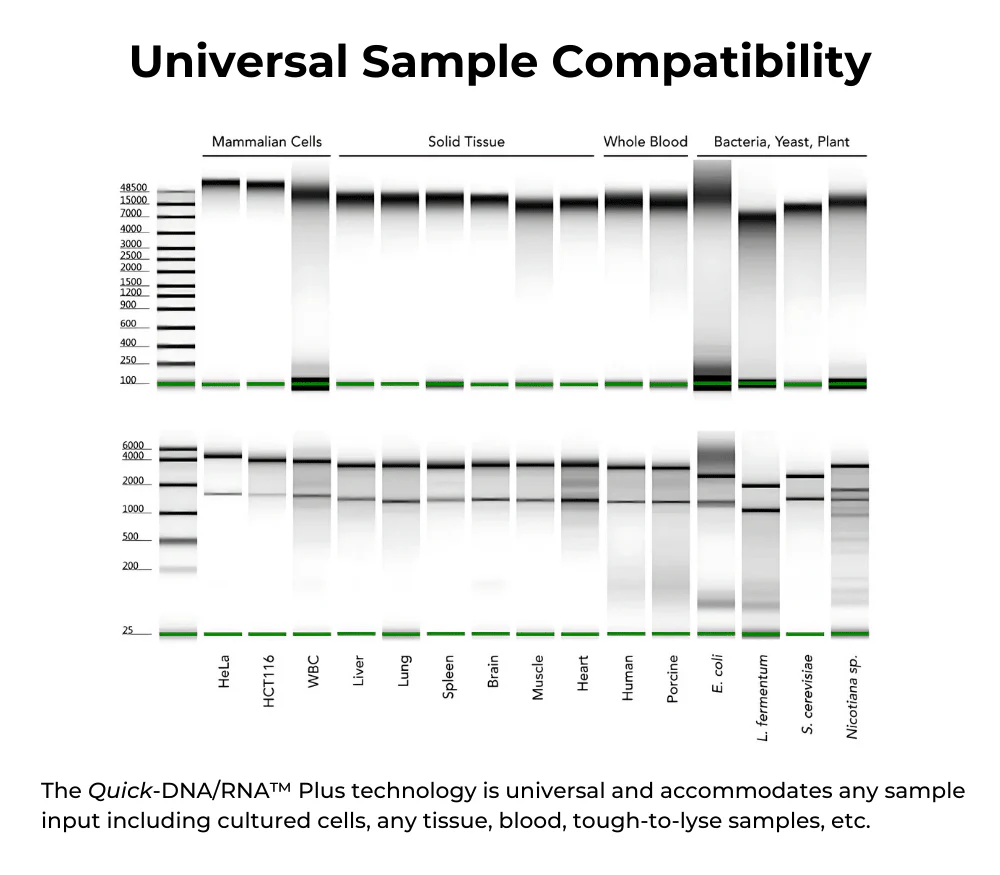 Size Limits | Genomic DNA up to and above 40 kb. Mitochondrial and viral DNA (if present) will also be recovered. Total RNA including small/microRNAs ≥17 nt. |