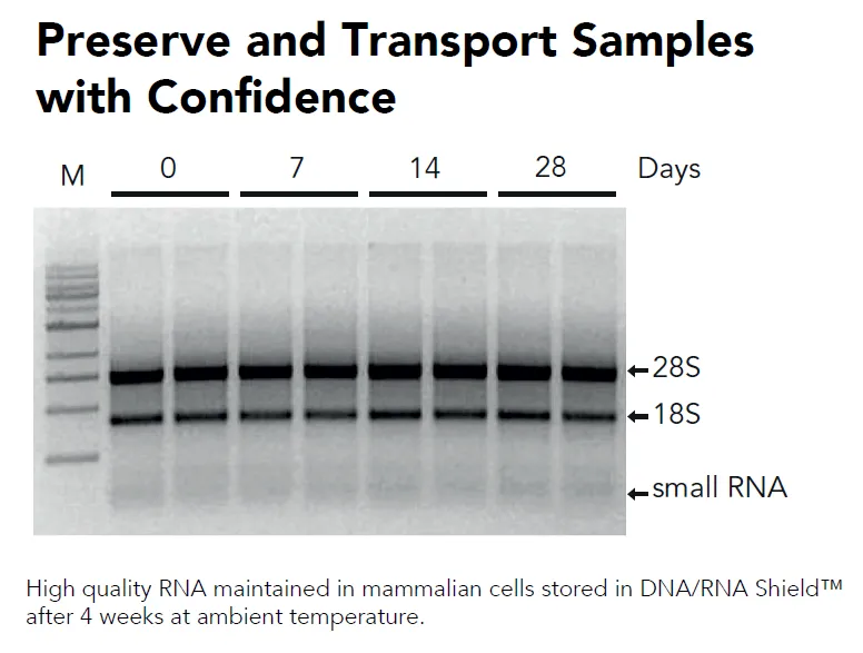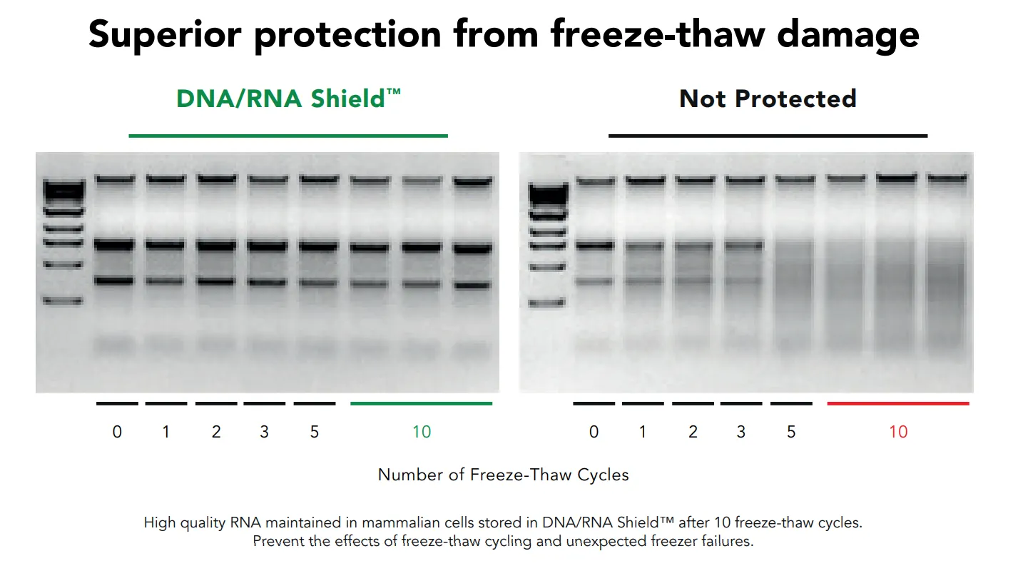 DNA/RNA Shield reagent is a DNA and RNA stabilization solution for nucleic acids in any biological sample. This DNA and RNA stabilization solution preserves the genetic integrity and expression profiles of samples at ambient temperatures and completely inactivates infectious agents (viruses, bacteria, fungi, & parasites). The unique DNA and RNA stabilization solution also prevents degradation from freeze-thaw cycling and unexpected freezer failures.
